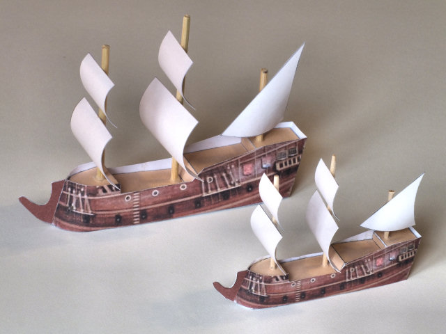 This kit allows the builder to chose between two model sizes. The larger model requires one sheet of A4white card (160gsm) for each model galleon built. Alternatively, the smaller version allows two models to be constructed from the same single sheet of card.